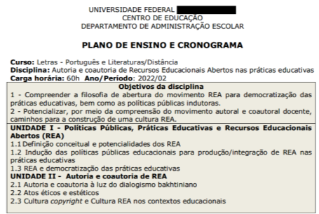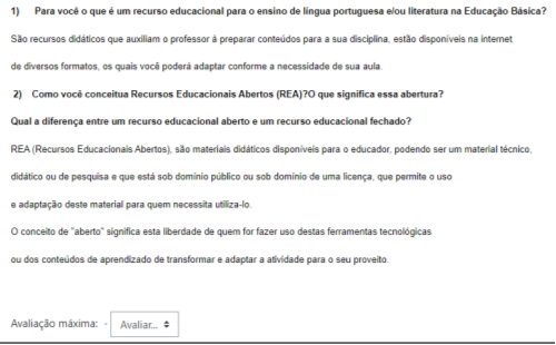 Em segundo lugar, a ação: ao longo da disciplina, perpassamos pela abordagem de recursos educacionais e avançamos para os princípios de abertura desses recursos. Para tanto, propusemos, como atividade inicial, um fórum de discussão. Em sequência, disponibilizamos novos conteúdos contemplando histórico dos REA, políticas públicas de fomento à sua integralização nas práticas pedagógicas, direitos autorais, licenças abertas, características dos REA e repositórios de REA. Como atividade de estudo a partir dessas leituras, propusemos a produção de um glossário, contemplando conceitos basilares do universo dos REA. Após toda essa contextualização, avançamos para leitura e estudos sobre autoria com base no dialogismo - preceito bakhtiniano (Bakhtin, 2006, 2011) -, ou seja, nos embates e nos consensos das diferentes vozes que constituem o nosso discurso no processo autoral, haja vista que a nossa voz é produto da voz do outro. Assim, contemplando, também, os conceitos de atos éticos e atos estéticos na autoria. Como atividade de estudo final, organizamos a produção/autoria de REA, em diferentes gêneros textuais, sobre o ensino de Língua Portuguesa ou Literatura para as etapas da Educação Básica. Esse movimento autoral potencializou processos criativos na docência e aprimoramento dos conteúdos trabalhados na disciplina. Para todas as atividades realizadas pelos estudantes, elaboramos devolutivas audiovisuais e escritas.
