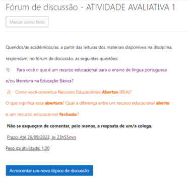 Como podemos observar na Figura 2, colocamos em debate, na Atividade 1 - fórum de discussão no Moodle -, o conceito de recurso educacional, justamente para avaliar o entendimento dos estudantes/professores em formação sobre os subsídios dos quais os professores lançam mão para criar situações de ensino-aprendizagem. Ao evoluirmos para a conceituação de REA, enfatizamos o valor da abertura.