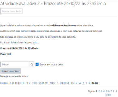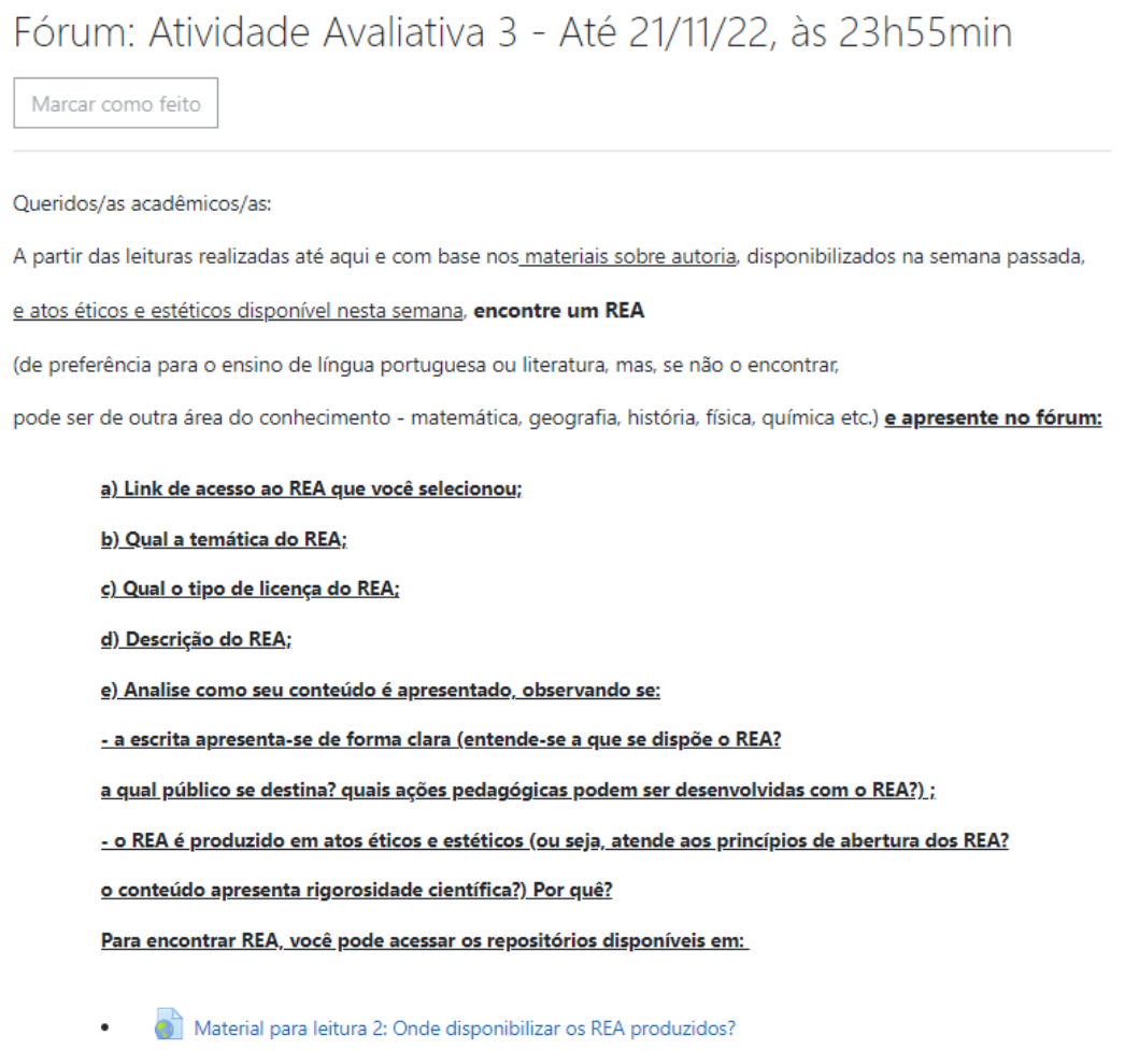 Contemplamos, nesta análise, apenas um recorte dos conceitos que compuseram o Glossário, mas já podemos inferir, pelos discursos materializados nas postagens, que a atividade, em interlocução com os conteúdos, potencializou a construção de conhecimentos orientadores da ação pedagógica docente para fortalecimento da cultura REA. Nesse mesmo caminho, planejamos e desenvolvemos a Atividade 3, cujo recorte apresentamos na Figura 7, a seguir.