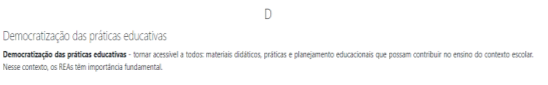Nesse sentido, a democratização, potencializada pela autoria de REA, converge para garantir o direito à Educação, tanto o acesso a ela quanto a permanência nos contextos educacionais e a conclusão dos estudos com sucesso. Isso, porque, na mesma linha da Educação Aberta, os REA caminham nas trilhas da colaboração, do acesso ao conhecimento para todos, da cultura de autoria docente em rede e do compartilhamento de concepções e de práticas pedagógicas entre professores. Compreender, portanto, o próprio conceito de democratização das práticas educativas/pedagógicas (Figura 5) é necessário, no repertório de conhecimentos da docência, e é caminho para o fortalecimento da cultura REA.