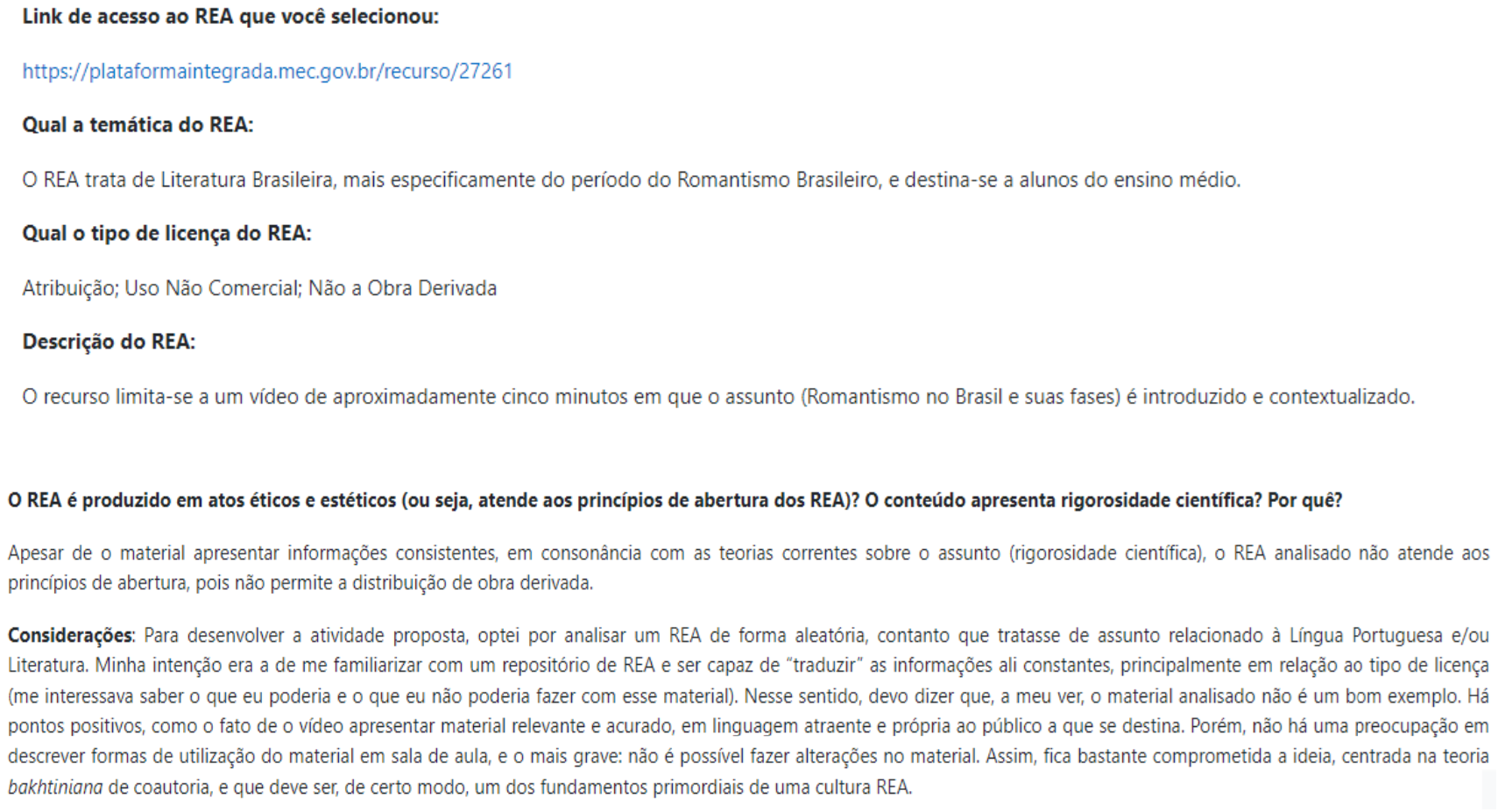Ao agir sobre o recurso, o Estudante/Professor em formação D pode identificar a temática do REA, a licença adotada, a finalidade e o público-alvo a quem se destina. Além disso, analisou em que medida o recurso se demonstrou responsivo ao movimento REA. Nesse aspecto, alega que, em termos de conteúdo, o recurso contempla rigorosidade científica e atende às especificidades de material didático. Embora apresente esse ponto positivo, argumenta que “o material analisado não é um bom exemplo” (discurso materializado na Figura 8) de REA, haja vista o inexistente repertório de informações sobre possibilidades da sua integralização nas situações de ensino-aprendizagem. Ainda, há outro aspecto, adjetivado como “o mais grave”: “não é possível fazer alteração no material” (discurso materializado na Figura 8), pontua ele.