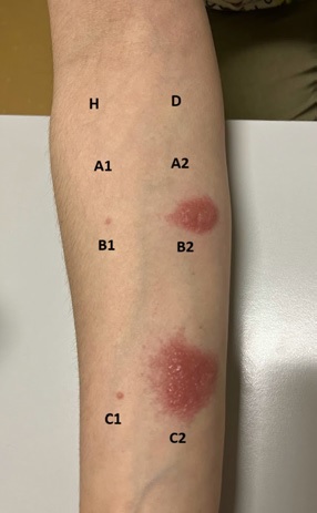 A 31 years old female was referred to the Allergy and Clinical Immunology Department (ACID) due to a pruritic, generalized micropapular exanthema that developed 12 hours after the first dose of amoxicillin/clavulanic acid 875/125mg for a dental infection. She denied other symptoms but noted th lesions persisted, necessitating systemic medication. She had previously tolerated this medication. Epicutaneous tests with amoxicillin and clavulanic acid, both in 10% petrolatum were performed, on the lateral upper arm, with negative results at the 72 hours reading. Skin prick and intradermal tests (IDT) with benzylpenicillin (10000 IU/mL), amoxicillin (20 mg/ml), and amoxicillin/clavulanic acid (20 mg/ml) at non-irritative concentrations were negative on immediate reading1. However, 10 hours later, localized pruritic erythema appeared, evolving into 5 cm diameter vesicles on the amoxicillin and amoxicillin/clavulanic acid IDT sites. The patient was initially treated with medium-potency topical corticosteroids, but due to progressive worsening, systemic corticosteroids and antihistamines were initiated on day 3, leading to resolution in 10 days. The routine practice of late IDT reading is not established in Portuguese ACID, although delayed reactions may occur with varying severity2,3. Given the extent of the lesions and lack of response to topical corticosteroids, systemic therapeutic optimization was chosen, highlighting the severity of this local reaction(Figure 1).