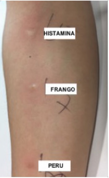 Foi referenciada a consulta de alergia alimentar, onde realizou: 1) Testes cutâneos por picada a extratos comerciais a alimentos e ainda picada-picada com carne de frango e carne de peru cozinhadas, que foram positivos, apresentando pápulas de 7,5mm e 3mm respetivamente (Figura 1); 2) Doseamento de IgE específicas para carne de frango e peru, que foram negativas. Para avaliar a reatividade cruzada com outras carnes de aves foram realizadas provocações oral (PPO) com peru e pato, que foram negativas. A identificação de sensibilização a determinados aeroalergénios em testes por picada e por IgE’s especificas séricas foram negativas. Recomendou-se a evicção da carne de frango e a liberalização do consumo de carne de outras aves, incluindo a de peru.