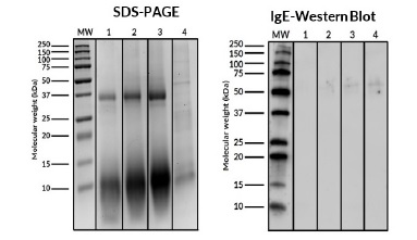 A extração de proteínas seguiu protocolos validados para fontes alergénicas. As amostras foram analisadas por eletroforese em gel de dodecil sulfato-poliacrilamida (SDS-PAGE). O perfil antigénico foi determinado através de IgE-Western Blot, utilizando o soro da própria doente.