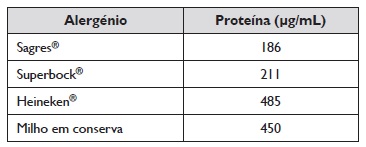 Para estudo da alergia ao milho, foram obtidos extratos proteicos das seguintes amostras alimentares: Milho em conserva (1/5 peso/volume); cerveja Sagres® (volume direto); cerveja Superbock® (volume direto); cerveja Heineken® (volume direto).