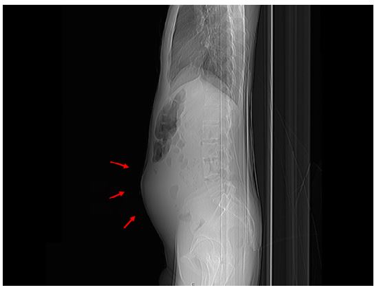 Physical examination revealed a thin appearance (body mass index = 16.9 kg/m2, z-score = -1.33), a distended and painful abdomen with tenderness, and a palpable mass with a rock-hard consistency in the hypogastric region. Abdominal radiograph (Figure 1) showed marked abdominal distension without air-fluid levels. Abdominal ultrasound revealed a large heterogeneous retroperitoneal mass in the midline of the abdomen and another lobulated hypoechoic mass near the rectum, suggestive of conglomerate lymph nodes or neoplasm.