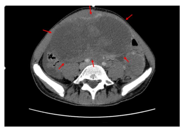 To further characterize these findings, an abdominopelvic computed tomography scan was performed (Figure 2), which revealed a midline mesenteric mass measuring 17.3 x 8.4 cm, along with multiple other ill-defined masses in the abdominal, retroperitoneal, and pelvic regions with areas of necrosis highly suggestive of an aggressive neoplastic process. In addition, there was evidence of peritoneal carcinomatosis and liver metastases. Complete blood count and biochemistry, including uric acid and lactate dehydrogenase levels, were within normal ranges.