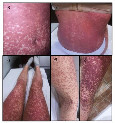 A 17-year-old girl, previously healthy, presented to the emergency department with a generalized reddish-purple pruritic rash. She gave a history of fever, sore throat and malaise starting 14 days before. She was medicated on the third day of disease with azithromycin for three days. Three days after completing treatment, she developed a rash initially erythematous and maculopapular, widespread all over the body. Over the next days, the lesions became coalescent and purpuric. Fever resolved on the 11th day of the illness. Physical examination showed good general condition, pharyngeal erythema and exudate, and a scattered purpuric exanthema over the entire body, including face, palms and soles (Figure 1), without any other complaints such as mucous-membrane involvement, arthralgias, hepatomegaly, facial or peripheral oedema.
