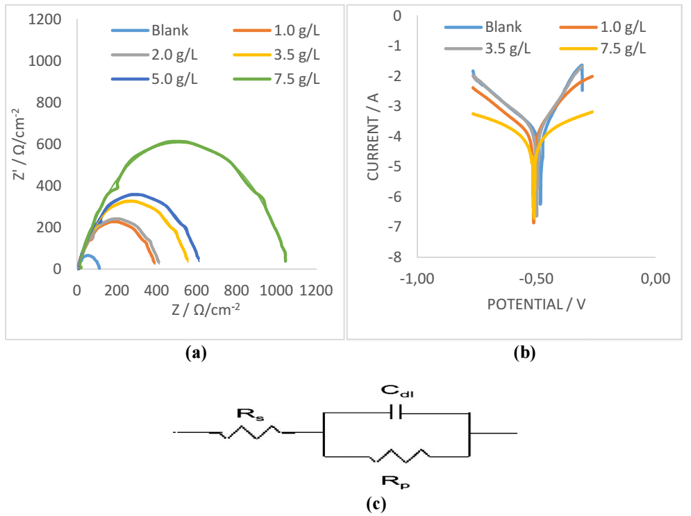 Figure 1: (a) Nyquist plot; (b) Tafel plot; and (c) electrochemical equivalent circuit diagram for CI of MFe in 1 M HCl.