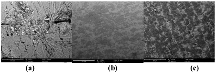 Figure 5: Images obtained from SEM for Fe corrosion in: (a) pure 1 M HCL; (b) with 1.0 g/L SAA; and (c) with 7.5 g/L SAA.