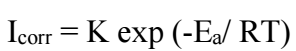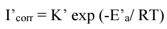 The variation in icorr logarithm, as a function of T-1, indicates that Arrhenius law was obeyed, which was confirmed by R2 and R2' > 0.90 good linearity.