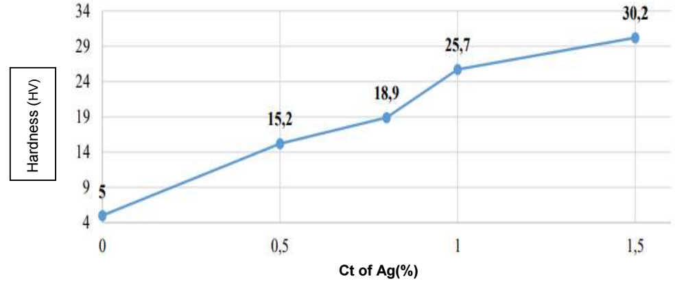 It is clearly seen that, with higher Ct of Ag, the alloy hardness increased, going from 5 HV, for pure Pb, up to 30.2 HV, for Pb-1.5% Ag. This effect was probably due to the decrease in the alloy grains initial size after Ag addition.