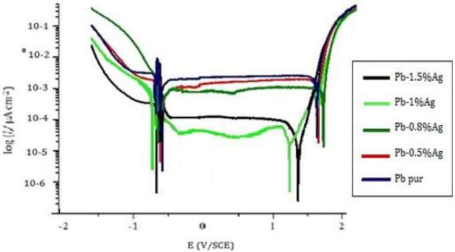 18 has done some research on the effect of Ag and Ca addition on Pb corrosion in H2SO4. The author has found that the alloy with the best IE(%) was Pb-1% Ag. Also, 19 has found that this quantity of Ag has given the alloy the best resistance to corrosion.