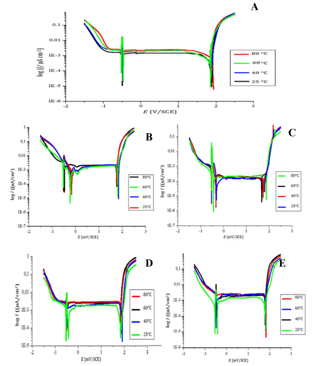 Fig. 5(a) shows Pb polarization curves in H2SO4 at T range from 25 to 80 ºC, while Table 3 shows polarization parameters.