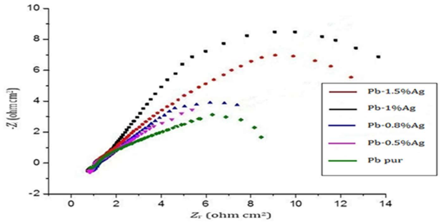 Nyquist representations in Fig. 7 have the shape of a unique semi-circle, which means that the main reaction mechanism present at Cdl was Rct. With an increase in the Ct of Ag up to 1%, it is seen that the semi-circles diameter was wider. This indicates a stronger corrosion resistance at this Ct of Ag. As shown in Table 5, Rct increased from 18 to 150 ohm/cm2 with a raise in Ag up to 1 wt%, while Cdl decreased from 75 to 9 µF/cm2. This reveals that the CR of Pb decreased and, consequently, its lifetime increased. Beyond this Ct, CR began to increase again 16.