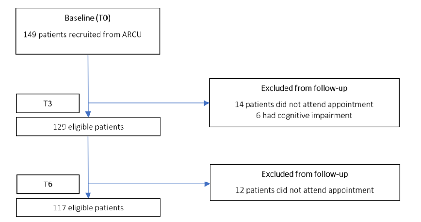 One hundred forty-nine patients were discharged to ambulatory follow-up. Of those, 117 patients were included in the analysis (Fig. 1). Four patients were excluded due to dementia and 2 due to Down syndrome at T3. No patient refused to participate or withdraw informed consent during the study period.