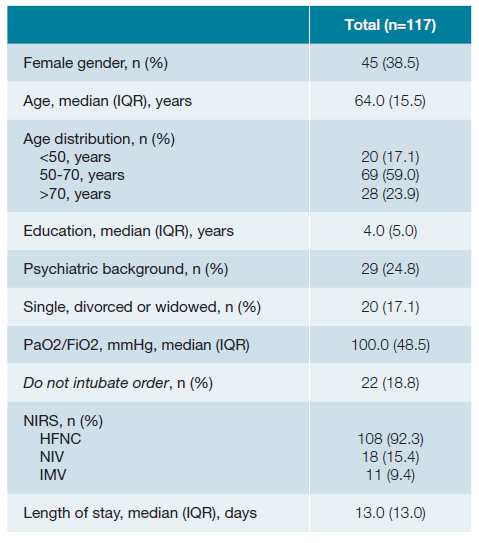 Demographic and clinical information was prospectively obtained both during hospitalization and outpatient visits. Information regarding demographics, comorbidities [Charlson Comorbidity Index (CCI) and psychiatric background], education, marital status, NRS techniques, laboratory findings, length of stay and therapeutic ceiling concerning candidacy to IMV were collected during hospitalization. Laboratory findings considered included PaO2/FiO2 as a marker of disease severity; and C-reactive protein, procalcitonin, ferritin and interleukin-6 as markers of inflammation.