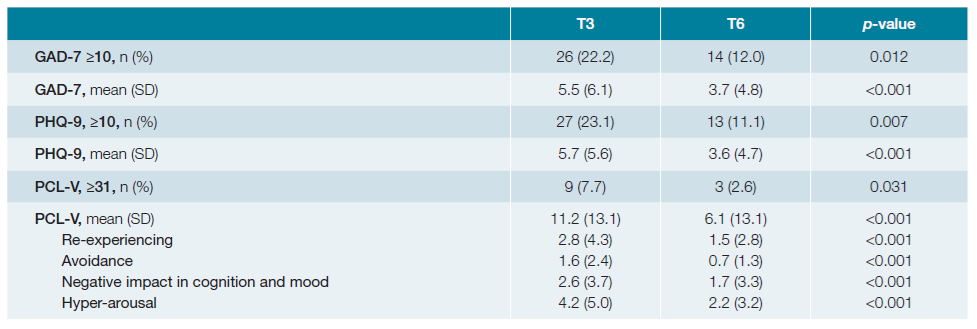 Table 2 presents GAD-7 and PHQ-9 and PCL-V scores evolution over time. At T3 evaluation, 26 and 27 patients were provisional diagnosed with generalized anxiety disorder and major depression, respectively. Only 9 patients scored for PTSD at T3. At T6, about half of the patients showed mood and anxiety improvements. This was equally noticed in all PTSD domains.