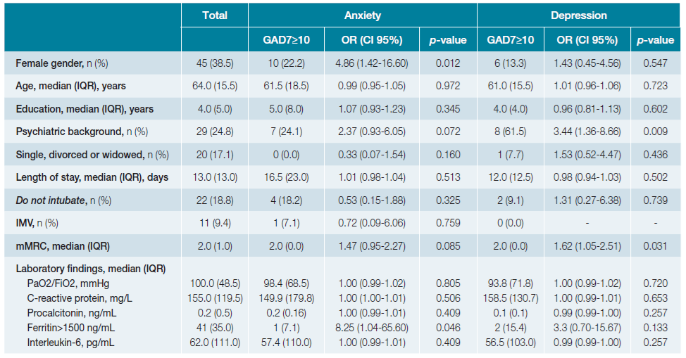 Predictors of psychiatric outcomes were evaluated for anxiety and depression (Table 3). This analysis was not conducted for PTSD due to the low number of diagnosis 6 months after discharge. Female gender and serum ferritin levels were associated with increased risk of anxiety. The likelihood of depression disorder was correlated with the psychiatric background and mMRC dyspnea scale. Interestingly, an association between psychiatric outcomes and age, marital status, education, length of stay, invasive mechanical ventilation, do not intubate order, severity of acute respiratory distress syndrome, was not found.