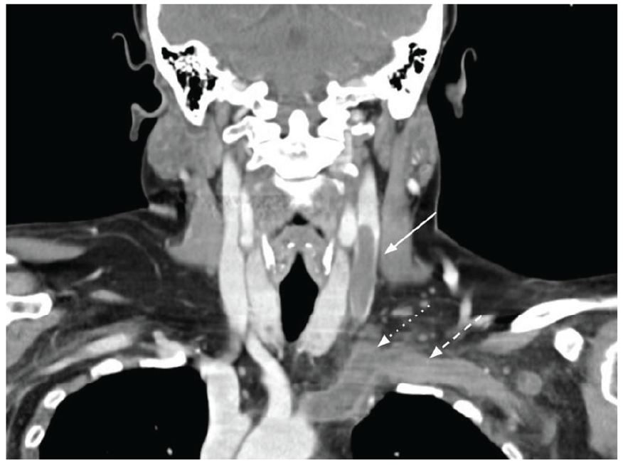 Figura 1: Corte coronal de TC evidenciando volumoso trombo na veia jugular interna (seta cheia), com extensão ao tronco braquiocefálico (seta em picotado) e veia subclávia (seta em tracejado).