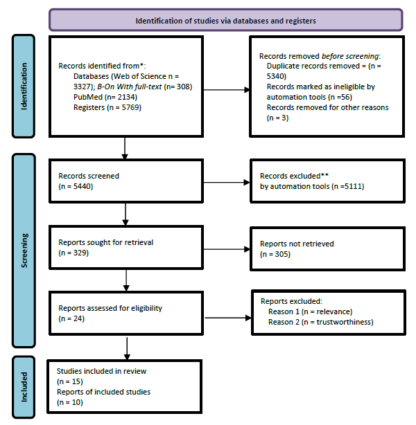 To assess the relevance and trustworthiness, two authors independently appraised all included articles using the JBI. Studies were excluded if including nurses, health professionals or informal family caregivers as participants; case studies and theoretical reviews; and studies not in Spanish, Portuguese and English. The inspection process reached a consensus and generated fifteen records published, but only ten studies met the inclusion criteria for further analysis. Three researchers (SCMR, CAVS, and PMAP) screened the titles, abstracts, and then full texts of the remaining fifteen articles according to inclusion and exclusion criteria. The full-text papers were read thoroughly, several times to capture all relevant information and to ensure that nothing important was missed. Disagreements were resolved by consensualizing with the researchers (MJN and DT) when required, and finally, results were summarized and reported.