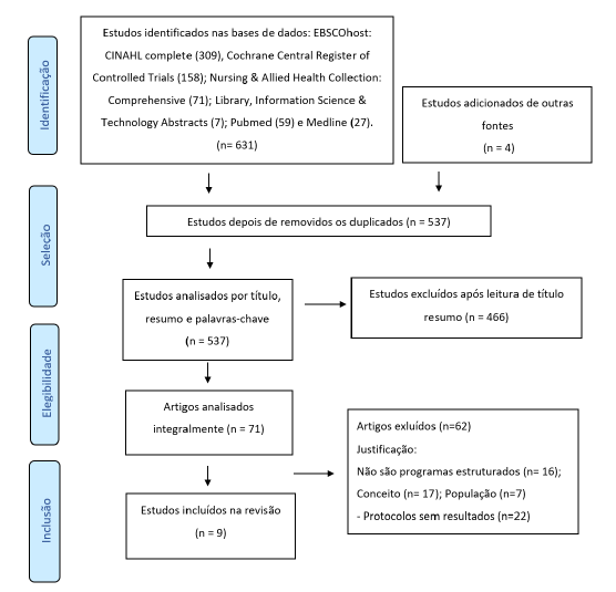A pesquisa inicial identificou 631 artigos, foram ainda integrados quatro estudos que resultaram de pesquisa nas listas de referências. Foram selecionados nove estudos, conforme apresentado na figura 1.