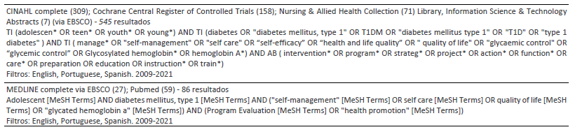 Como critérios de inclusão foram considerados: estudos que envolvessem adolescentes com DM1, cujo foco fossem intervenções promotoras de autogestão e que integrassem as competências de autogestão definidas por Lorig e Holman (2003) (e.g., definição de objetivos, planeamento, resolução de problemas, tomada de decisão procurar e utilizar os recursos, formação e estabelecimento de parcerias com a equipa de saúde e plano de ação); foram incluídos estudos que integrassem pelo menos uma competência de autogestão como resultado.