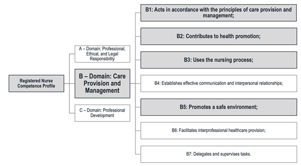 According to “Ordem dos Enfermeiros” (2012, p. 7), the certification of Registered Nurse competences “ensures that the nurse holds a set of knowledge, skills, and abilities applied in clinical practice, which enables them to assess the health needs of the target population and act across all life contexts and levels of prevention.” The core competence domains of the Registered Nurse include professional, ethical, and legal responsibility, care provision and management, and professional development.