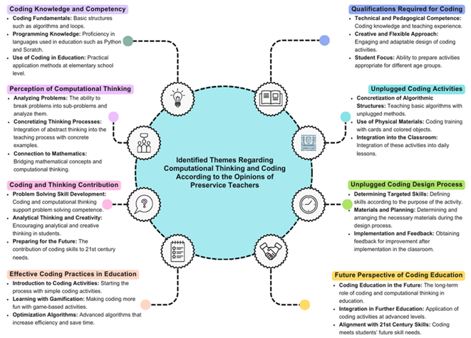 A general evaluation of preservice teachers' opinions in Figure 3 suggests that supporting design-based CT instruction enhances candidates’ pedagogical approaches and strengthens their inclination towards CT processes. Additionally, coding knowledge encourages deeper learning, supports abstract thought, and fosters creative and analytical thinking. It increases motivation by making learning enjoyable, adding interest to lessons, and enhancing pedagogical skills. Furthermore, coding knowledge offers an innovative perspective on diverse learning styles, facilitates comprehension of algorithms, improves process efficiency, and is anticipated to become increasingly essential in the future.