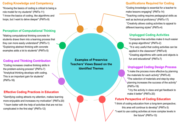 Figure 2 presents themes on the current situation based on preservice teachers' opinions. Specifically, preservice teachers' opinions were organised into eight themes, each containing three categories. The categories are coding knowledge and competency, perception of CT, coding and thinking contribution, effective coding practices in education, qualifications required for coding, unplugged coding activities, unplugged coding design, and future perspectives on coding education. Sample participant statements for each category are presented in Figure 3.