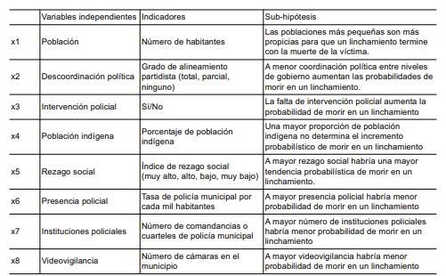 En esta investigación buscamos responder la siguiente pregunta: ¿cuáles son los patrones que presentan los linchamientos que se asocian con la muerte de sus víctimas en México? Para ello se elaboró un modelo de regresión múltiple con 139 casos para los cuales se encontró información para todas las variables del estudio y se plantearon tres hipótesis de trabajo con base en los principales debates teóricos de la literatura, así como en los hallazgos empírico-descriptivos que fuimos confeccionando.