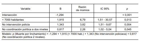 Se construyeron múltiples modelos de regresión logística múltiple. Como modelo final se eligió aquel con mayor pseudo R cuadrada con el menor valor de p. El propósito de emplear un modelo estadístico en este trabajo fue el de evaluar cuantitativamente más allá del azar los factores que previamente sobresalieron en relación con la muerte por linchamiento. Es decir, buscar una probabilidad de ocurrencia de un evento por encima de las visiones subjetivas.