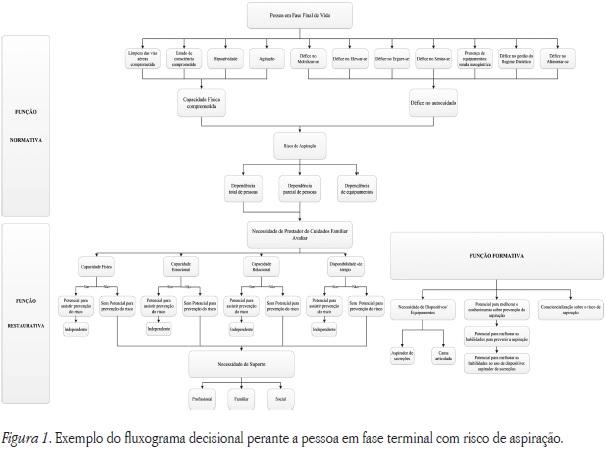 Resultados: Los datos del paciente terminal demuestran la función normativa de supervisión a través de los criterios de diagnóstico para el déficit en el autocuidado y los riesgos. La función formativa emerge cuando el cuidador familiar no posee conocimientos o habilidades para cuidar o incluso tomar consciencia de un determinado problema. Por último, la función restaurativa comprende la evaluación de la capacidad física, emocional y relacional de los cuidadores, así como la disponibilidad de tiempo y dispositivos necesarios.