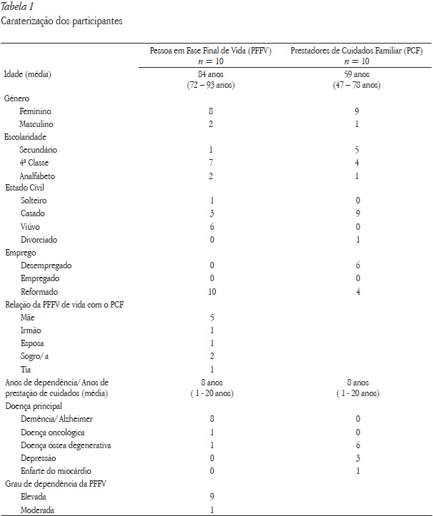 No estudo anterior, descritivo e de natureza qualitativa – etnografia – foi possível identificar as necessidades de cuidados das pessoas em fase final de vida em relação ao défice no autocuidado e riscos assim como as necessidades referidas pelos prestadores de cuidados familiares. Os participantes foram selecionados intencionalmente, com a ajuda de informantes privilegiados (enfermeiras e médicos de família). A abordagem qualitativa privilegia a amostragem criteriosa, ou seja, podem utilizar-se determinados critérios de inclusão para que se possa apreender o máximo sobre o foco tomar conta (International Council of Nurses [ICN], 2013).