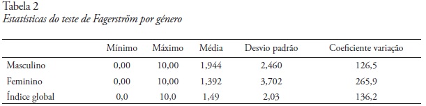 A média de dependência à nicotina é mais elevada no género masculino (M = 1,944 ± 2,460) do que no género feminino (M = 1,392 ± 3,702); 85,0% apresentam um nível de dependência à nicotina muito baixo ou baixo, 3,9% uma dependência média e 8,8% referem um nível elevado de dependência.