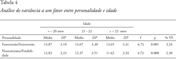 Em relação à idade, os estudantes com idade ≤ 20 anos revelam-se mais extrovertidos; os estudantes com idades ≥ 23 anos mostram-se mais introvertidos e mais neuróticos.