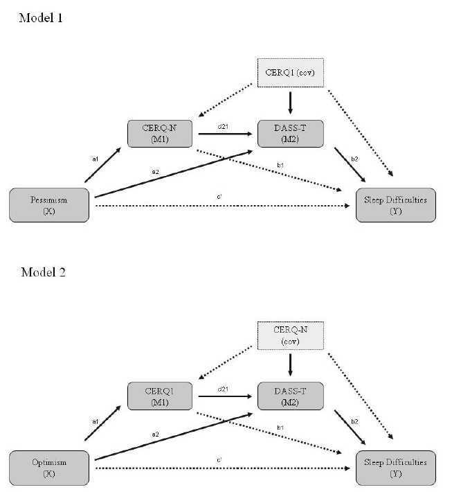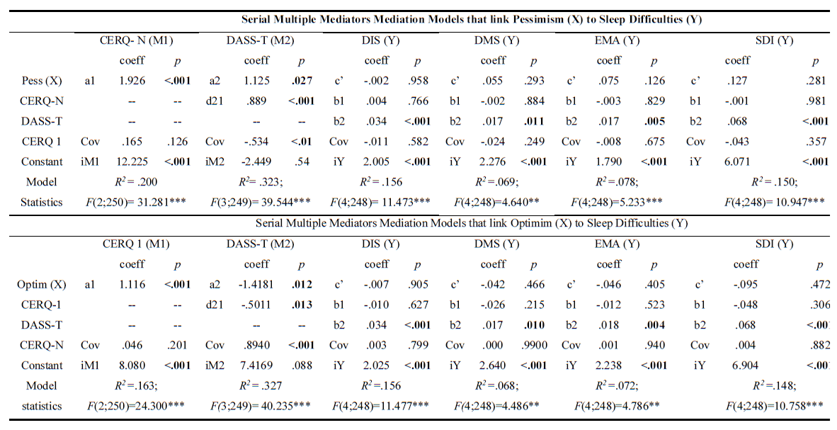 Table 2 Serial multiple mediators mediation models that linked pessimism (X1) or optimism (X2) to sleep difficulties (DIS. DMS. EMA and SDI), with the mediator 1 CERQ-N/ CERQ-1 and the mediator 2 DASS-T - Regression coefficients and model statistics.