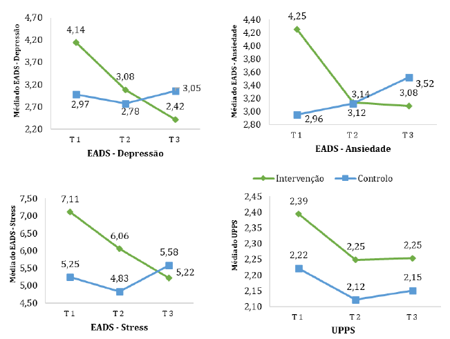 Verificaram-se efeitos de interação entre o grupo e o tempo nas subescalas de Depressão, F(1.77, 260.50) = 3.84, p = .027, η 2 = .025, Ansiedade, F(1.69, 248.03) = 4.42, p = .018, η 2 = .029, e Stress, F(1.77, 260.44) = 4.37, p = .017, η 2 = .029, o que sugere que os grupos evoluíram de formas distintas, destacando-se uma diminuição progressiva dos níveis de depressão, ansiedade e stress no grupo de intervenção, no decorrer do programa, ao passo que no grupo de controlo esses níveis aumentaram.