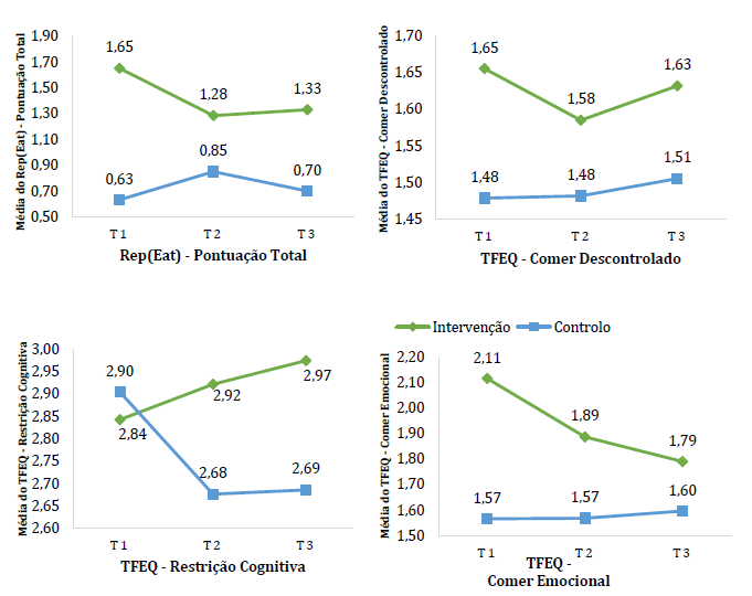 Apesar da Figura 3 demonstrar uma tendência em que o grupo de intervenção parece diminuir os níveis de comer descontrolado e comer emocional ao longo do programa, assim como parece aumentar os níveis de restrição cognitiva, contrariamente ao grupo de controlo, não se verificaram efeitos de interação e de tempo, respetivamente, nas subescalas de comer descontrolado (F(1.81, 159.53) = 0.20, p = .794, η 2 = .002; F(1.81, 159.53) = 0.23, p = .774, η 2 = .003), restrição cognitiva (F(1.69, 148.93) = 2.94, p = .064, η 2 = .032; F(1.69, 148.93) = 0.45, p = .605, η 2 = .005) e comer emocional (F(1.72, 150.97) = 3.20, p = .051 e η 2 = .035; F(1.72, 150.97) = 2.34, p = .110, η 2 = .026), sugerindo que não há diferenças significativas entre grupos, nas trajetórias destas variáveis, ao longo da intervenção.