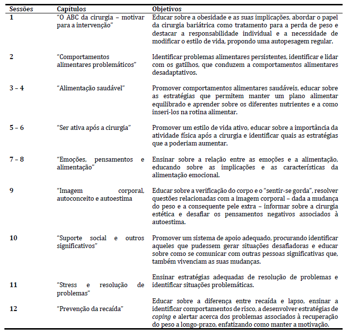 O grupo de intervenção, teve acesso a um conjunto de 12 sessões de intervenção em grupo, presenciais, de 1h de duração cada, distribuídas ao longo de 12-18 meses e das quais se disponibilizava uma por mês, ao longo desse período. Nesta sessão, abordava-se um dos capítulos do manual (Conceição et al., 2016) disponibilizado no programa. Este incluía um total de 9 capítulos, distribuídos ao longo da intervenção, tal como descrito na Tabela 1. Em determinados momentos (em média: aos 22 meses pós-cirurgia - avaliação inicial; aos 28 meses pós-cirurgia - avaliação intermédia; aos 34 meses pós-cirurgia - avaliação final), foram também avaliados por uma bateria de questionários. Estas sessões foram conduzidas por um psicólogo treinado, com os níveis de mestrado ou doutoramento.