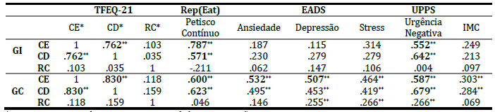 A Tabela 3 descreve as correlações encontradas entre as subescalas da variável de comportamento alimentar - TFEQ-21 - e as restantes variáveis, nos diferentes grupos. Verificou-se que (a) no grupo de intervenção: o comer emocional e o comer descontrolado associam-se forte e positivamente com o petisco contínuo e com a urgência negativa, assim como se correlacionam forte e positivamente entre si; (b) no grupo de controlo: o comer emocional associa-se forte e positivamente com o comer descontrolado, petisco contínuo, ansiedade, depressão e urgência negativa, e moderada e positivamente com o stress e IMC; o comer descontrolado associa-se forte e positivamente com o petisco contínuo e com a urgência negativa, e moderada e positivamente com a ansiedade, depressão, stress e IMC; a restrição cognitiva correlaciona-se moderada e positivamente com a depressão, stress e urgência negativa.
