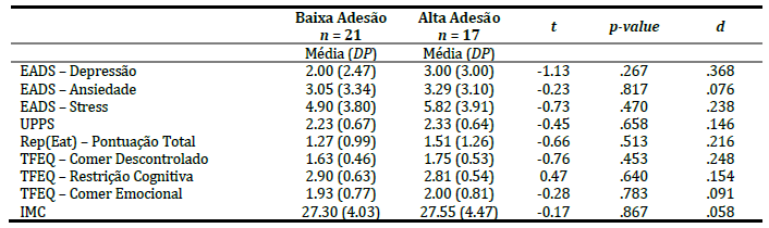 A Tabela 4 indica que não existem diferenças estatisticamente significativas entre os grupos de alta e baixa adesão, o que evidencia que as pontuações finais das variáveis de interesse não diferiram nos grupos.