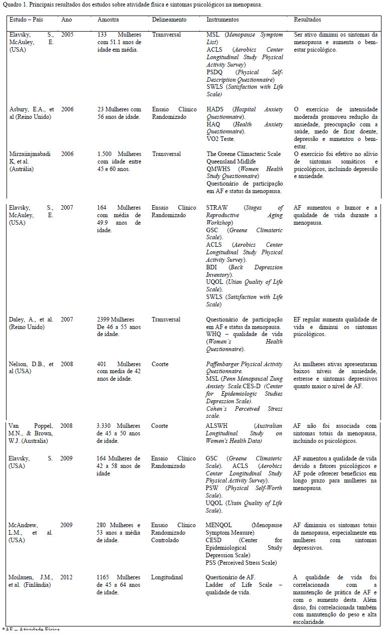 Quanto aos demais estudos analisados nesta revisão, todos (Asbury, et al., 2006; Daley, et al., 2007; Elavsky, 2009; Elavsky & McAuley, 2005, 2007; McAndrew, et al., 2009; Mirzaiinjmabadi, Anderson, & Barnes, 2006; Moilanen, et al., 2012; Nelson, et al., 2008), concordaram que a atividade física promove melhorias em relação aos sintomas psicológicos durante a menopausa, eis que os resultados destes estudos apresentaram redução da ansiedade, do estresse, diminuição dos sintomas depressivos, da preocupação com a saúde e do medo de ficar doente, além disso, verificaram também aumento do bem-estar e da qualidade de vida.