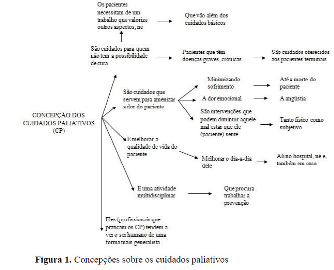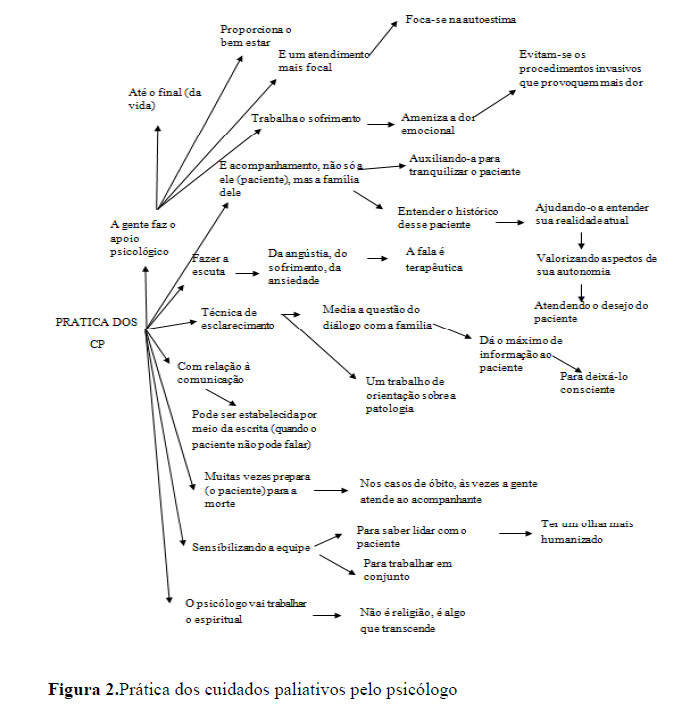 Conforme pode ser visualizado na figura 1, alguns profissionais de psicologia direcionaram a definição de CP para a assistência a pacientes que não apresentam prognóstico de cura, norteando suas ações para a obtenção de qualidade de vida para esses pacientes. Tais discursos estão alinhados aos de Santos, Pagliuca e Fernandes (2007) e Pessini e Bertachini, (2004), quando afirmam que os CP são medidas que objetivam o aumento da qualidade de vida de pacientes que enfrentam problemas associados a doenças ameaçadoras de vida.