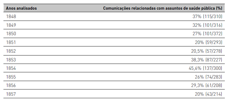 A partir da tabela 1, verifica-se que as comunicações sobre saúde pública são, praticamente, um terço das comunicações totais dos anos de 1848 e 1849. Esta percentagem expressiva pode ser explicada pelo receio que pudesse entrar no país a epidemia de cólera que assolava a Europa. A vigilância marítima era apertada e esse zelo obrigou a restrições maiores da navegação internacional, o que levou a um maior número de reclamações das entidades estrangeiras. Um surto violento de cólera apareceu na Rússia em 1847 e expandiu-se a seguir para a Escandinávia, contaminando a Finlândia e a Suécia22. A pandemia avançou pela Europa adentro, atingindo a Grã-Bretanha, a Alemanha e a França23. Esta incursão epidémica acabou por provocar mais de 50 mil mortos no Reino Unido e o dobro em território francês24. Em Portugal, o contágio foi evitado.