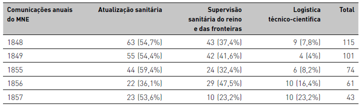 Através da pesquisa aprofundada das fontes existentes no Arquivo Nacional da Torre do Tombo e no Arquivo Histórico Diplomático, construiu-se uma tipologia de classificação das comunicações do MNE com o Ministério do Reino em matéria de saúde pública. Classificaram-se as questões sanitárias detetadas nos fluxos de transmissão diplomática em três categorias: 1) atualização sanitária; 2) supervisão sanitária do reino e das fronteiras; 3) logística técnico-científica. Estas categorias enquadram todas as comunicações relacionadas com assuntos de saúde pública, e foi possível decompô-las depois em subcategorias, como veremos mais à frente. Os resultados obtidos na pesquisa estão expressos nas tabelas 1 e 2. Na tabela 1, apresenta-se o peso dos assuntos relacionados com questões de saúde pública nas comunicações do MNE com o Ministério do Reino, para o período de 1848 a 1857. Na tabela 2, aplicou-se a referida categorização das comunicações durante o tempo em que se viveram os efeitos da grave epidemia de cólera na Europa, nos finais da década de 1840, e durante os surtos epidémicos mais impactantes em Portugal. Ou seja, a tipologia de classificação das comunicações incidiu sobre os anos de 1848, 1849, 1855, 1856 e 1857.
