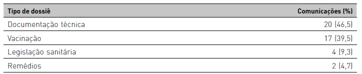 Quanto ao tipo de dossiê mais utilizado nas comunicações anuais da entidade diplomática, verifica-se uma preponderância da correspondência sobre atualizações sanitárias (tabela 2). Apenas em 1856, a categoria da supervisão sanitária de fronteiras tem mais peso. Nesse ano, há muita correspondência e debate sobre os problemas levantados pela fiscalização naval do CSPR a navios britânicos, uma constante nas décadas de 1840 e 1850. Os dossiês de logística técnico-científica atingem o seu valor máximo de preponderância em 1857, quando são quase um quarto das comunicações totais, equivalendo-se ao número de cartas enviadas com questões relativas à fiscalização das fronteiras. Tal deveu-se ao facto de ter sido um ano em que a Grã-Bretanha forneceu a Portugal várias remessas de pus vacínico e de, nesse mesmo período, se terem registado poucas queixas em relação a constrangimentos na circulação de navios estrangeiros em mares portugueses.