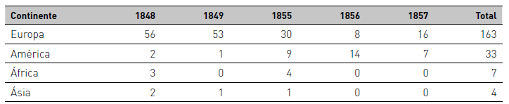 Nos anos de 1848, 1849, 1855 e 1857, o maior volume de informação recolhida veio dos vários cônsules e representantes portugueses na Europa. Em 1856, a América foi a principal fonte de atualização sanitária, devido ao grande número de comunicações emitidas pelos cônsules brasileiros. Da correspondência analisada, 74,6% foi proveniente da Europa, 19,4% da América, 5,2% de África, e 0,7% da Ásia. Os problemas de saúde pública no continente europeu centravam a atenção das autoridades portuguesas e mais de um terço das comunicações tiveram a sua origem na grande crise de cólera que devastou a Europa em finais da década de 1840, proveniente da Rússia.