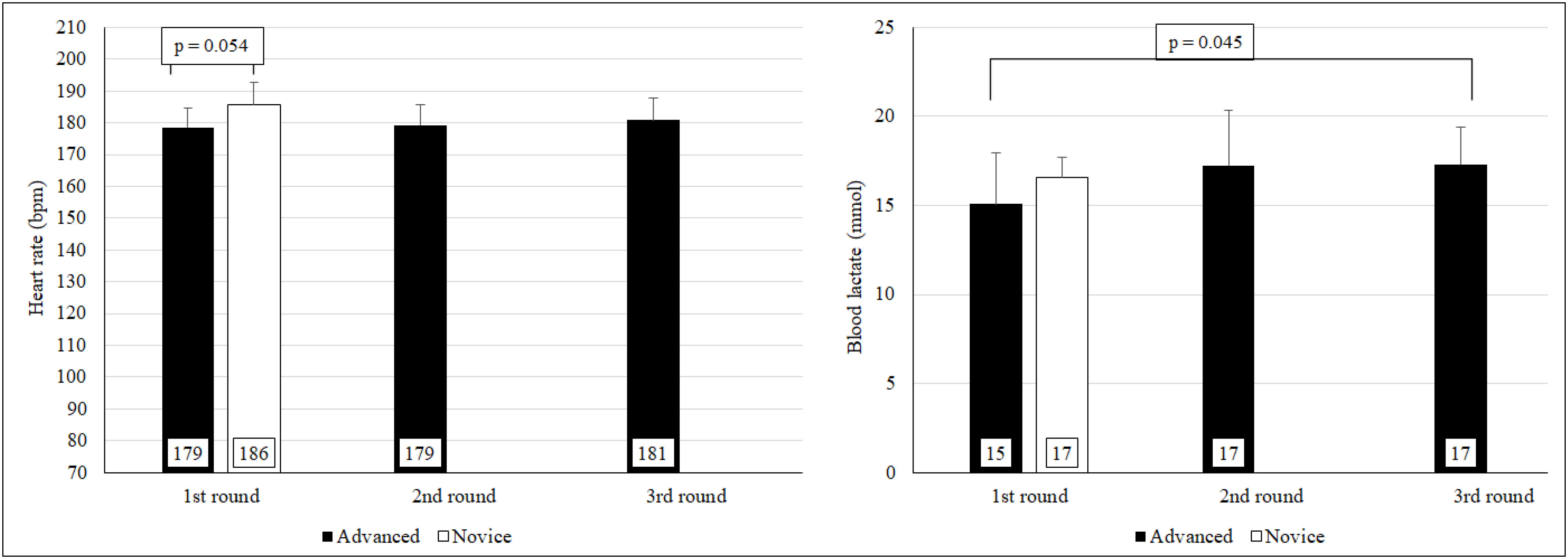 Heart rate is a relevant parameter to evaluate and monitor in combat sports athletes (Slimani et al., 2018). Various tests, such as the Special Judo Fitness Test (Franchini et al., 2009), correlate heart rate with the number of projections, with a lower index in the test revealing better performance. From a physiological point of view, the average HR (absolute and relative) during the first test round was higher in the group of novice athletes, which may be due to better aerobic fitness among advanced fighters (Del Vecchio & Ferreira, 2013), promoting lower cardiorespiratory demand during ASAMMA (Bounty et al., 2011).
