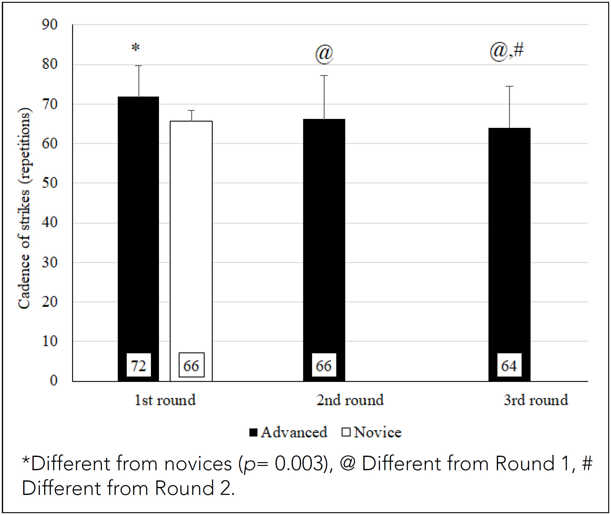 There were differences identified between groups considering the number of sequences of movements performed in the first round of ASAMMA (p= 0.003; d= 1.046), with advanced athletes presenting 71.8± 7.87 strikes and novices exhibiting 65.6± 2.87 strikes. The comparison between rounds was only possible in the first group (Figure 3). In relation to the advanced athletes, the analysis of repeated measurements of cadence of strikes according to round (rounds 1, 2 and 3) showed statistically significant differences between moments (F(2;10)= 14.37; p< 0.001; η²= 0.61), and the Bonferroni post-hoc identified that the differences are located between rounds 1 and 2 (p= 0.04), 1 and 3 (p= 0.005) and 2 and 3 (p= 0.017). Finally, regarding the fatigue index, a performance of 0.90± 0.08 is indicated, and of the 10 advanced athletes, only one presented a score classified as moderate (0.74).